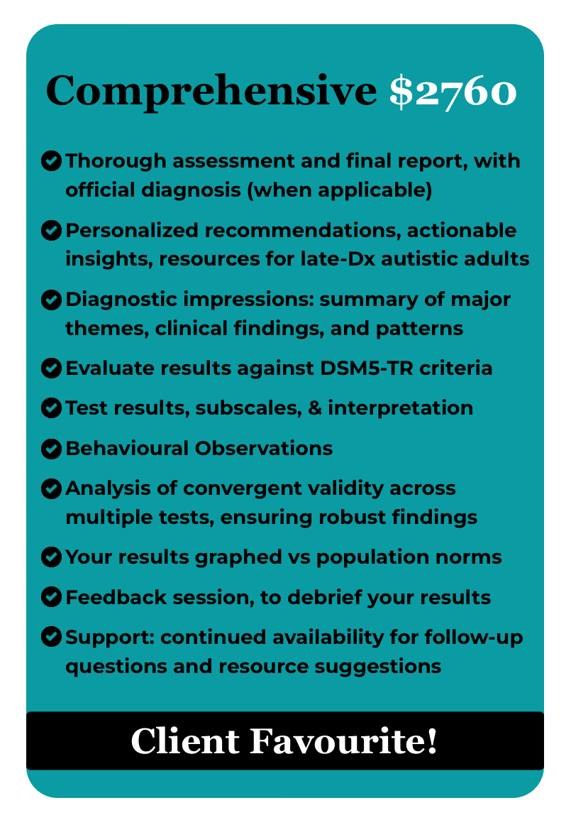 Adult assessments are nuanced (e.g., masking, possible history of trauma, differential diagnoses, etc.), but we handle the complexities so you don’t have to! Our autism evaluations are transparent, straightforward, and neuro-affirming, focusing on discovery and recognition, though we do provide official diagnoses when relevant.
