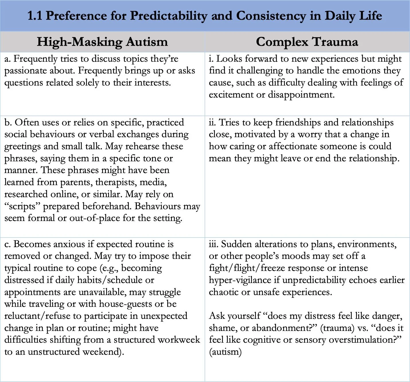 Below is a self-reflection tool to help adults differentiate between high-masking autistic experience and complex trauma.